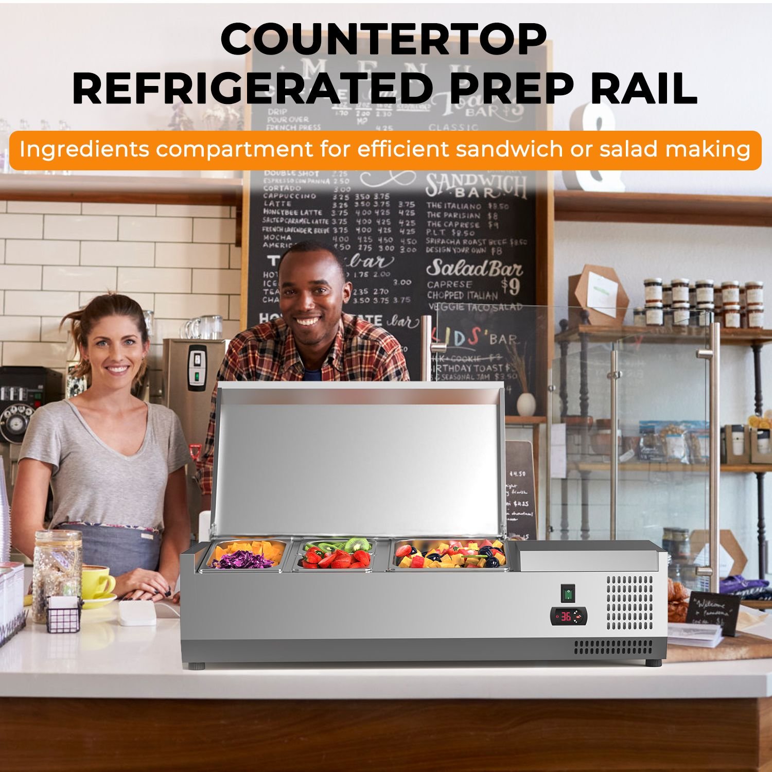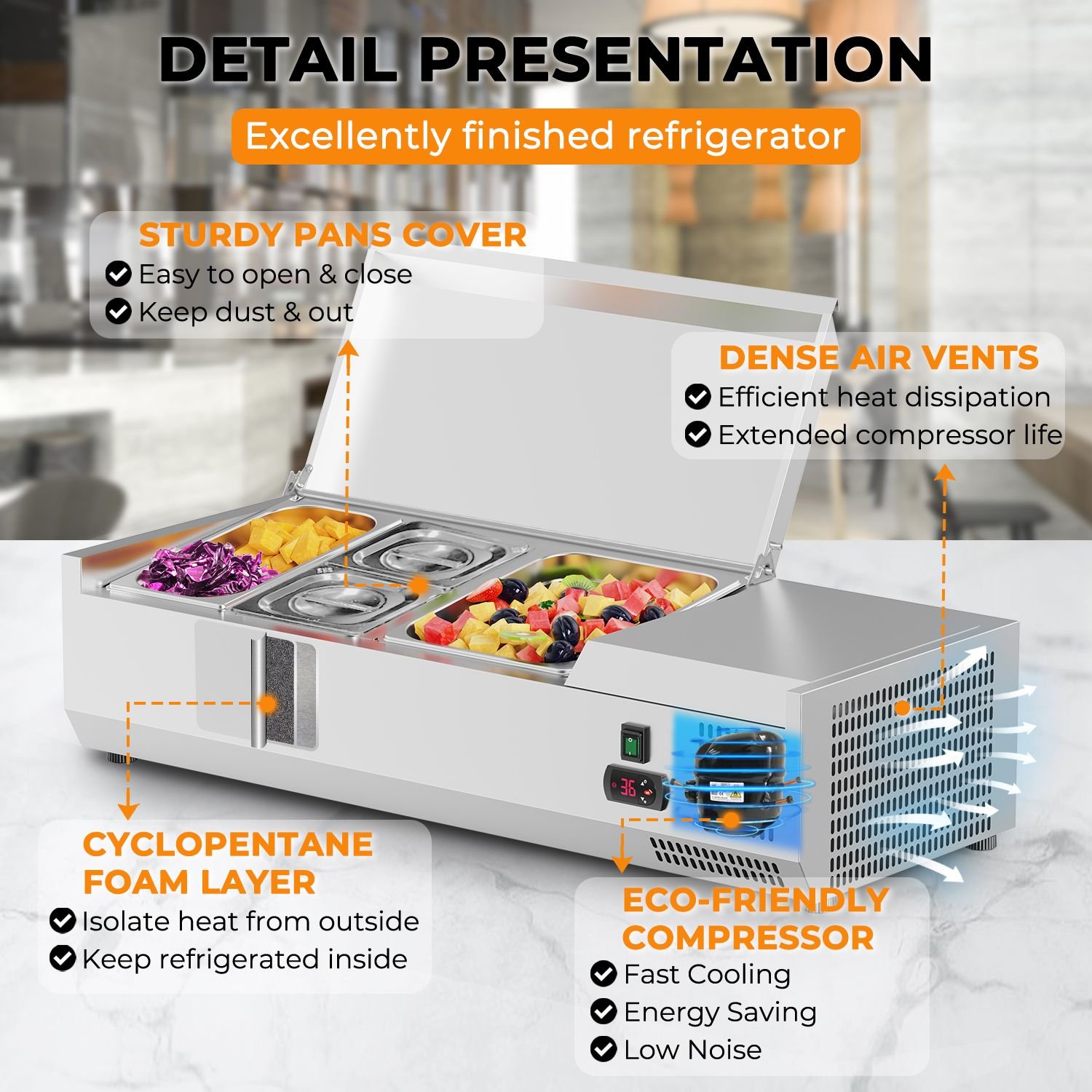 [Perfect Assistant] Our countertop refrigerated sandwich salad prep table is perfect for storing sliced tomatoes, lettuce, onions, fruit, ice cream and more, making your catering service more efficient. It helps you keep ingredients fresh and ready for presentation and serving. NOTE: This refrigerated prep rail should be used during business hours to keep pre-chilled foods cold and fresh, not for continuous or extended storage.TIPS: Please pay attention to the information update and phone smooth, facilitating the delivery of your package. When you received the refrigerator, please tear off the plastic protective film and let it stay for over one day before power to use.