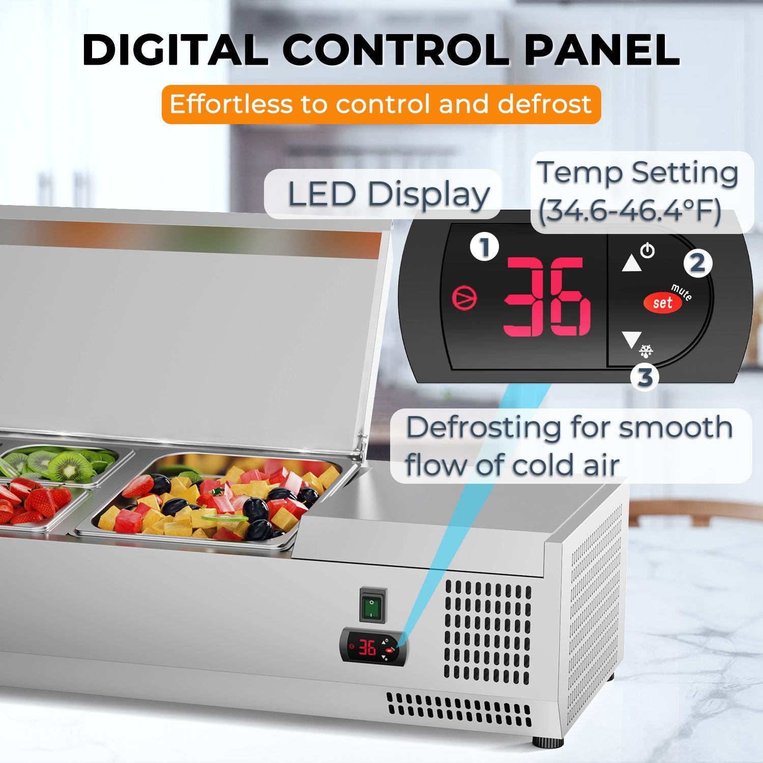 [Easy to Control and Defrost] This countertop condiment prep station has an integrated electronic thermostat. The external digital LED panel displays accurate temperature, allowing you to monitor interior temperature at a glance. You can set the temperature between 34.6°F and 46.4°F. In addition, it is also equipped with a one-click defrost function to ensure that cold air flows smoothly inside the box without any blockage. Prepare evenly cooled and fresh ingredients.
