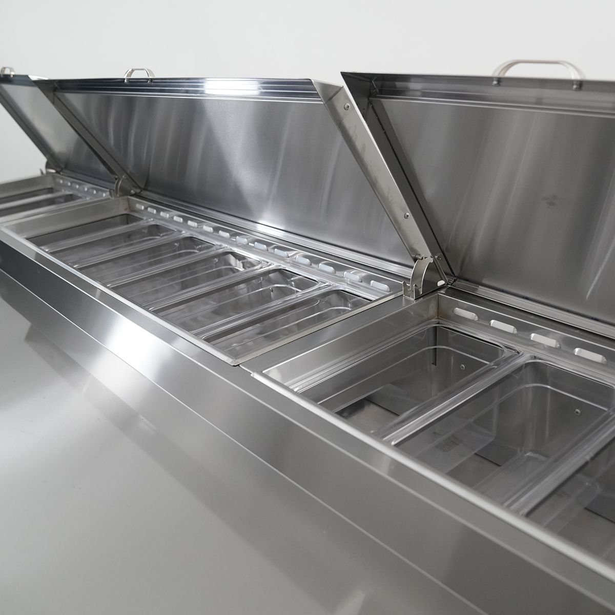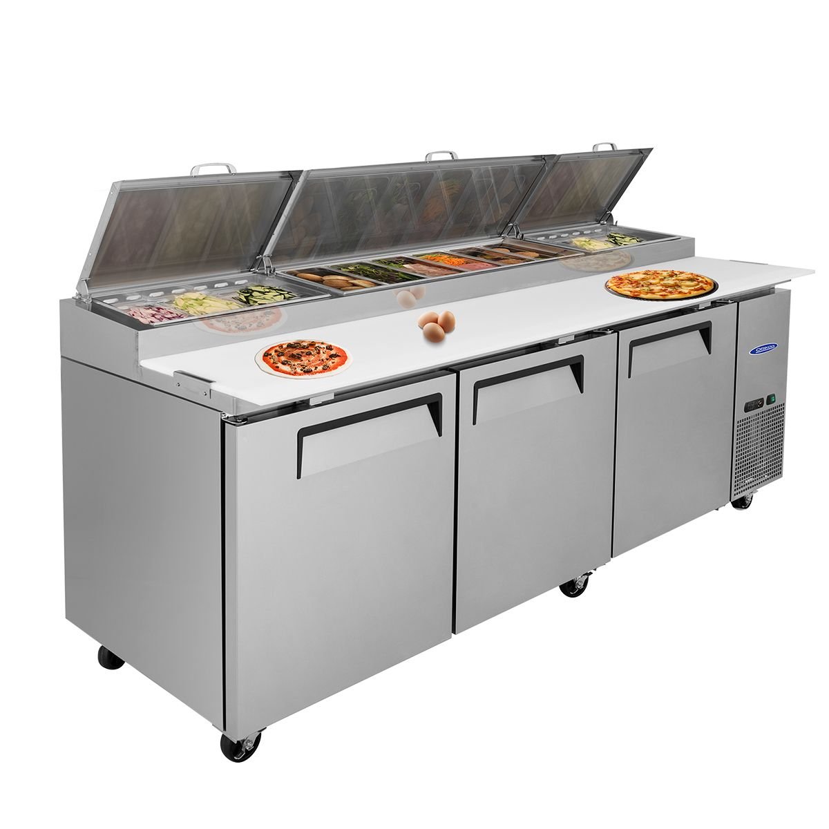 Effective Food Preparation: Streamline pizza preparation with our Refrigerated Pizza Prep Table—large cutting board for quick assembly, storage for twelve 1/3 size food pans, and a removable cutting board for easy cleaning. Crafted for durability, it's an essential for efficient, high-quality pizza production. The lift-up lid features three opening angles, ensuring flexibility and convenience.