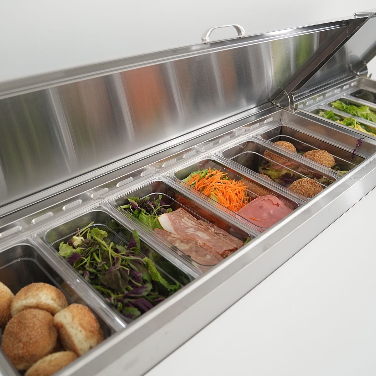 Effective Food Preparation: Streamline pizza preparation with our Refrigerated Pizza Prep Table—large cutting board for quick assembly, storage for nine 1/3 size food pans, and a removable cutting board for easy cleaning. Crafted for durability, it's an essential for efficient, high-quality pizza production. The lift-up lid features three opening angles, ensuring flexibility and convenience.