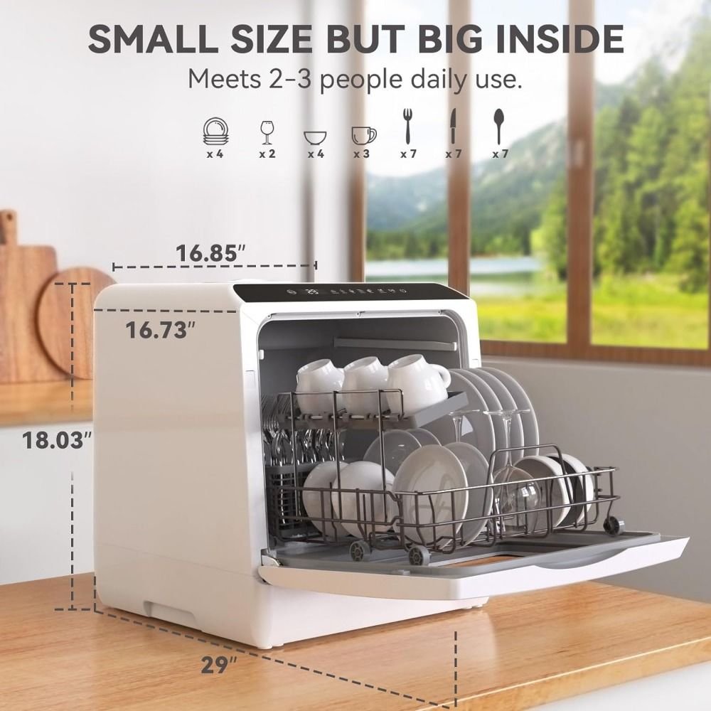 • [COMPACT DESIGN]This portable dishwasher only measures 16.85 × 16.73 × 18.03 inches with a standard capacity of 4 place settings and can fit a variety of dishes (up to 10.25-inch dishes loaded at an angle). Efficiently meeting the daily needs of a family of 3-4, This portable dishwasher is perfect for small-sized houses, apartments, dorms, boats, and campers/RVs.