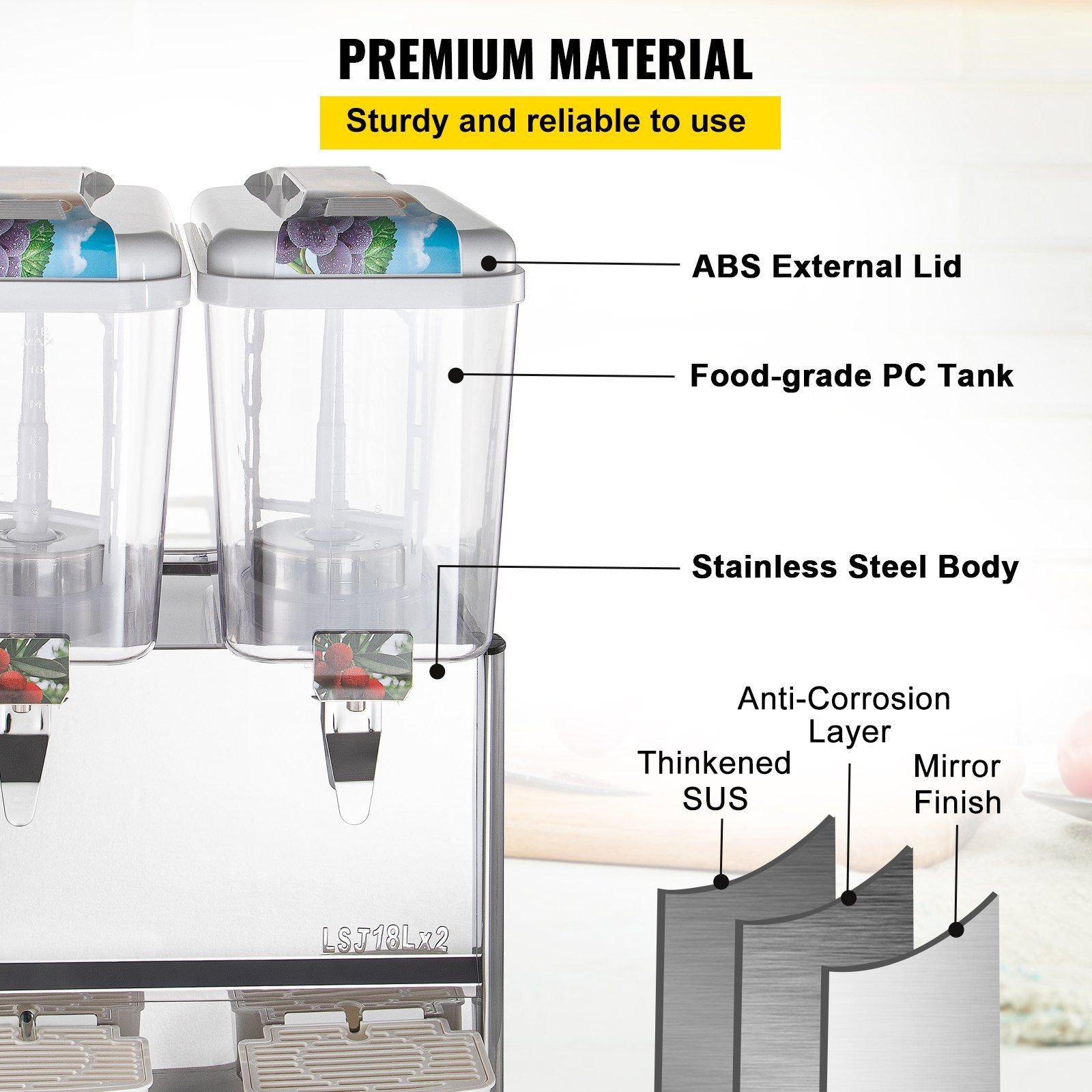 BPA-free and shock-proof food-grade PC containers distinguish from those fragile ABS/AS tanks. 3-layer machine body with enhanced rigidity. Fashionable mirror stainless steel surface, sturdy and easy to clean.Stainless steel evaporator for excellent cooling effect.