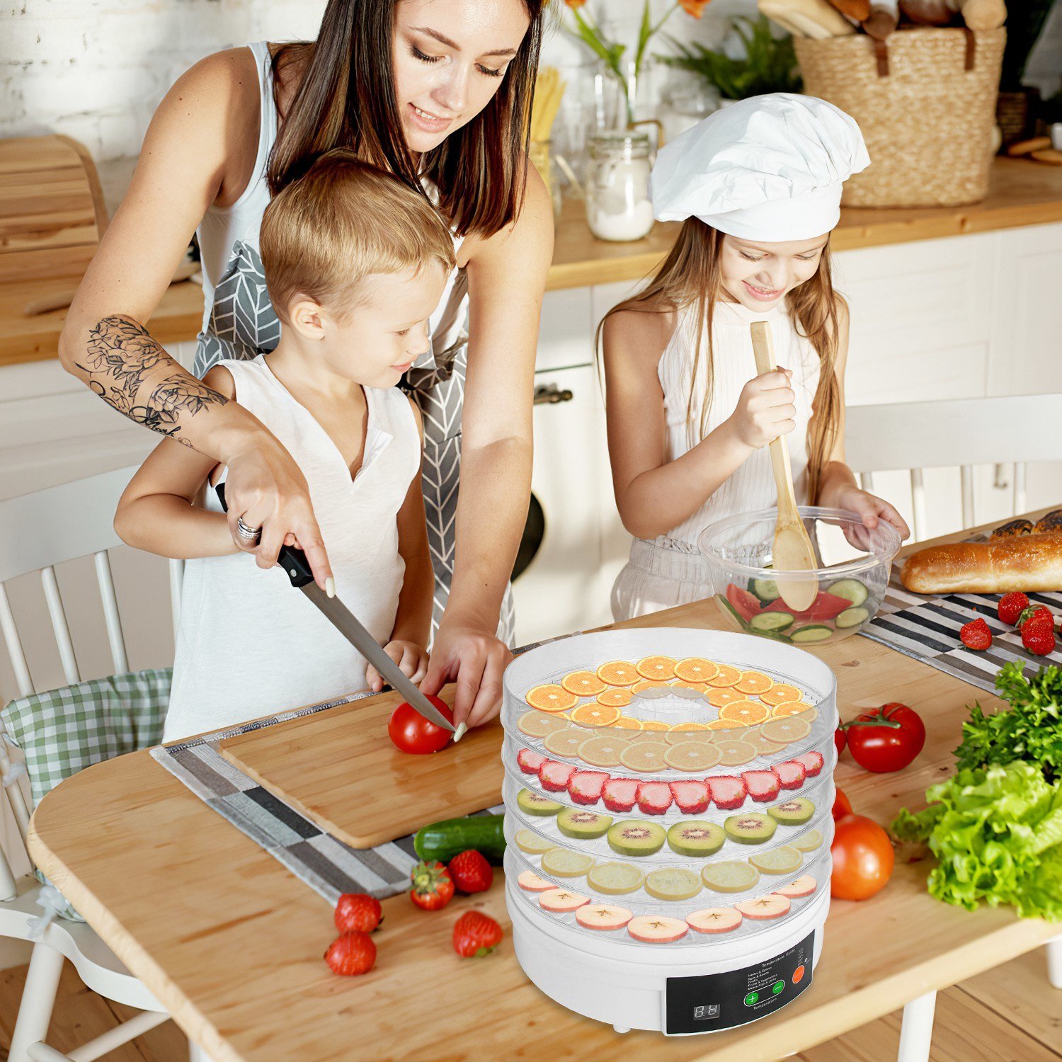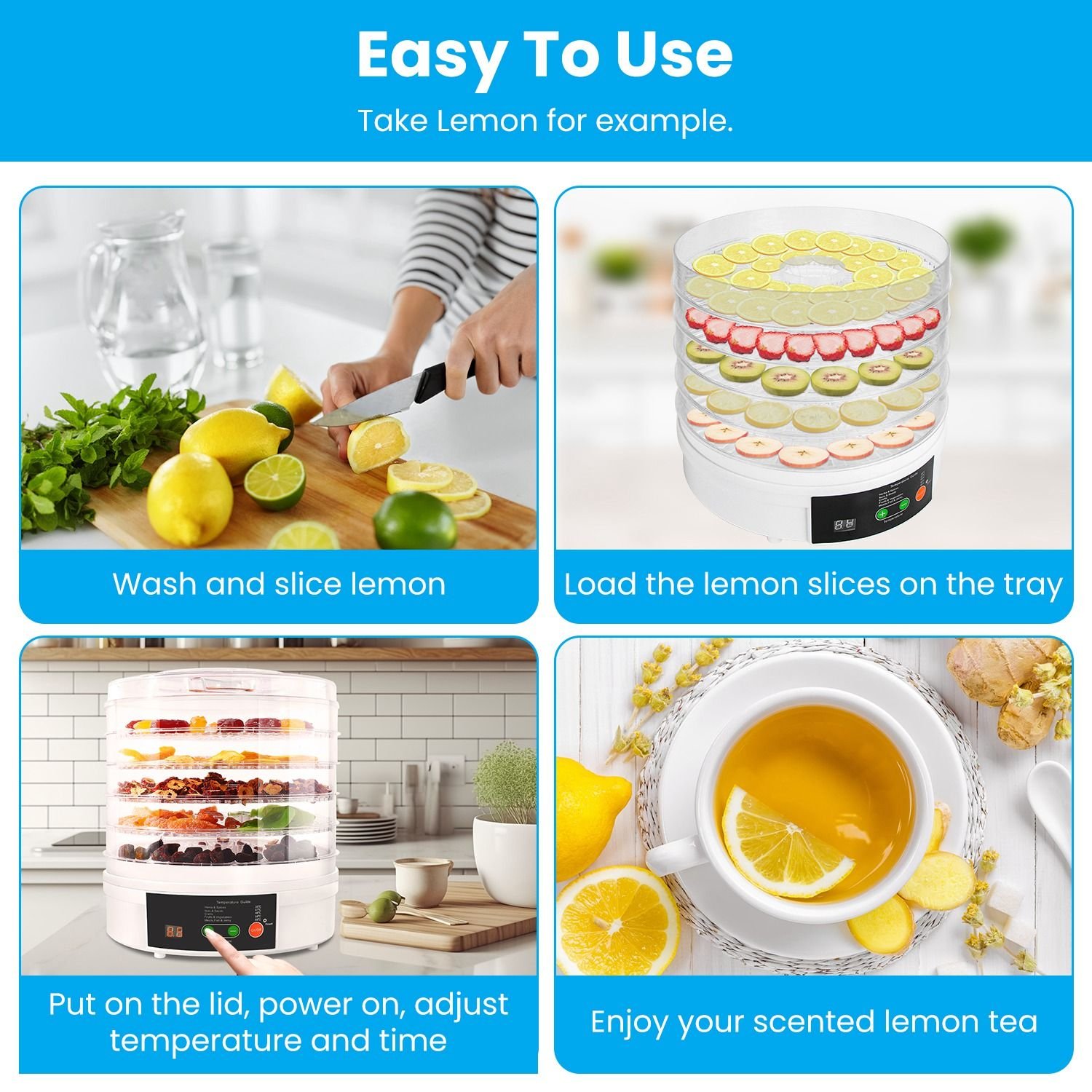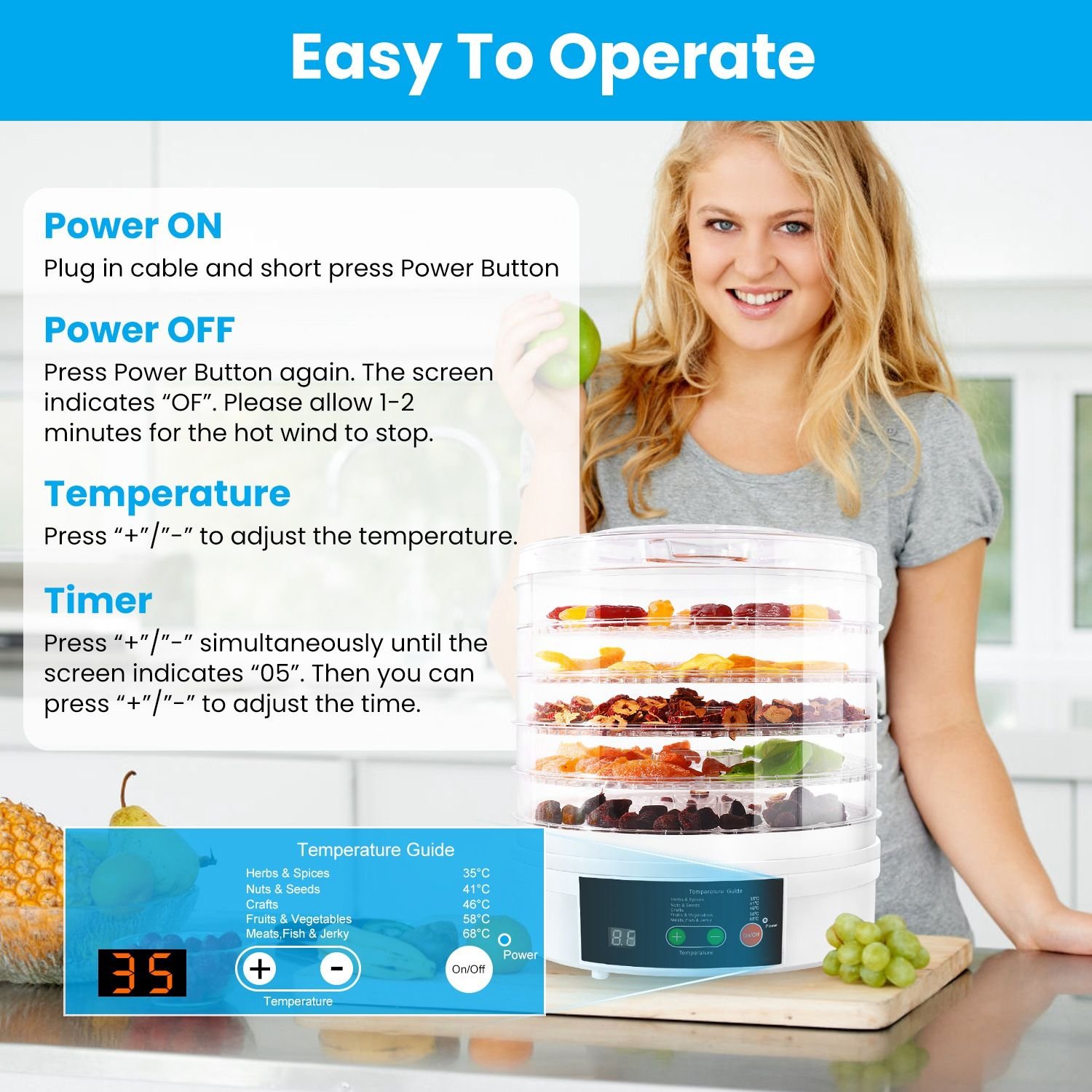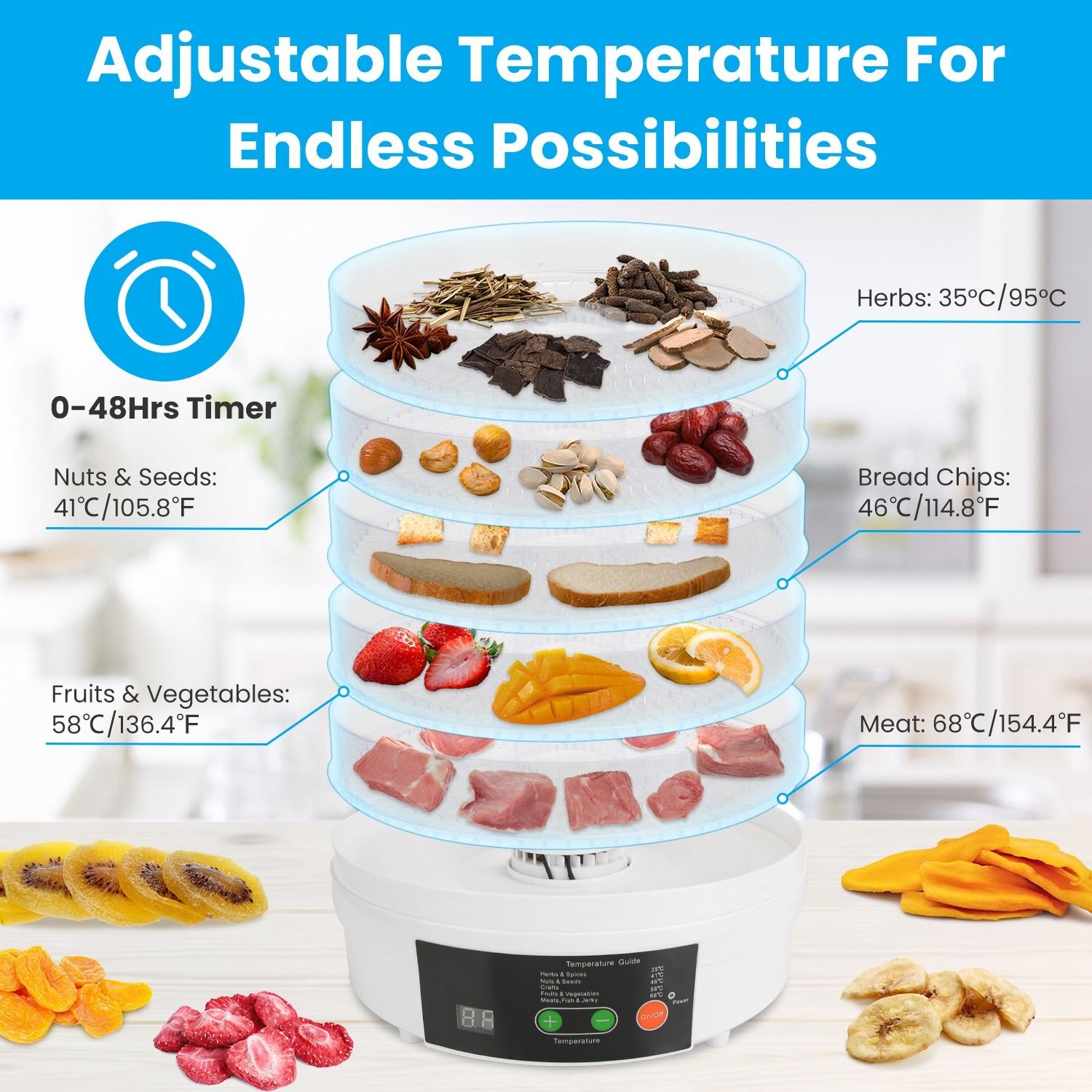 *5 Adjustable Temperatures For All Foods*:Designed with 5 temperature settings from 35℃/95℉ to 68℃/154.4℉,this food drying machine dehydrate a wide variety of foods,such as fruits and vegetables for healthier snacks,herbs for cooking and seasoning use,seeds/nuts/meats/fish/jerky for enhanced flavor and crunch etc..