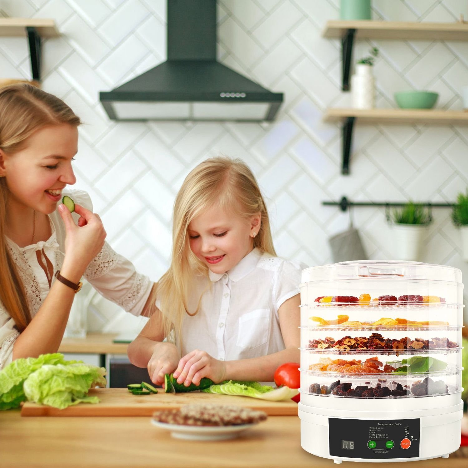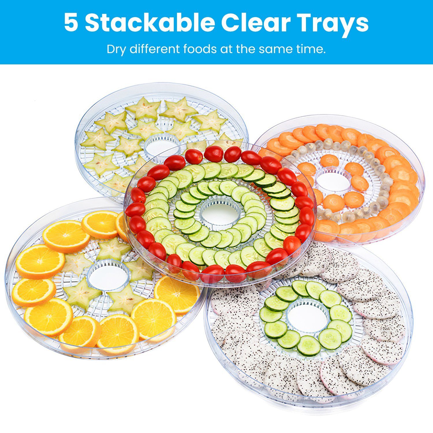 *5 Stackable Clear Trays*:The electric digital Food dehydrator machine offers 5 trays for larger quantities of dried foods,stackable and space-saving. The transparent design allows you to monitor the dehydrating process with ease,convenient for temperature and time adjustment. The trays are dishwasher safe,easy to clean.