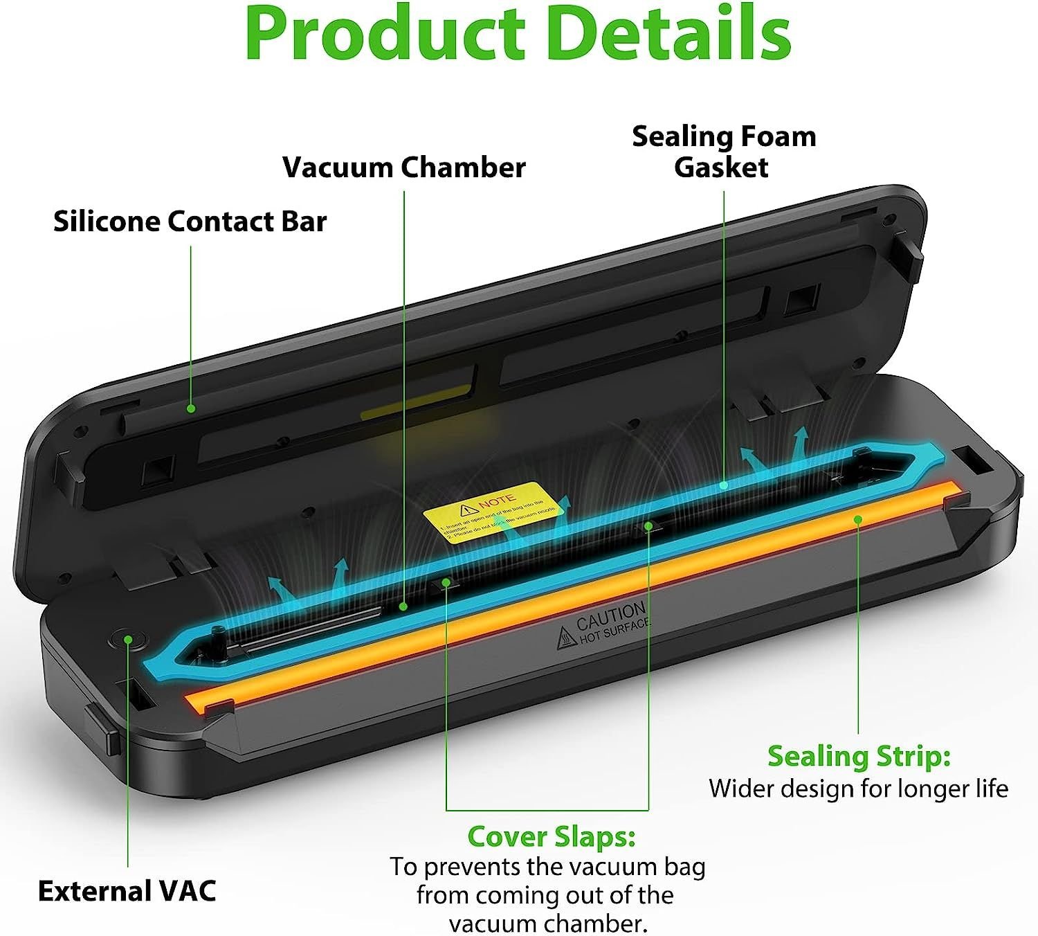 5.Starter Kits - Along with the vacuum sealer and air suction hose, packaging contains: an extra sealing foam gasket, 5 medium vacuum bags (7.9†x 11.7â€), 5 large vacuum bags (11†x 15.7â€), both kinds are reusable and waterproof