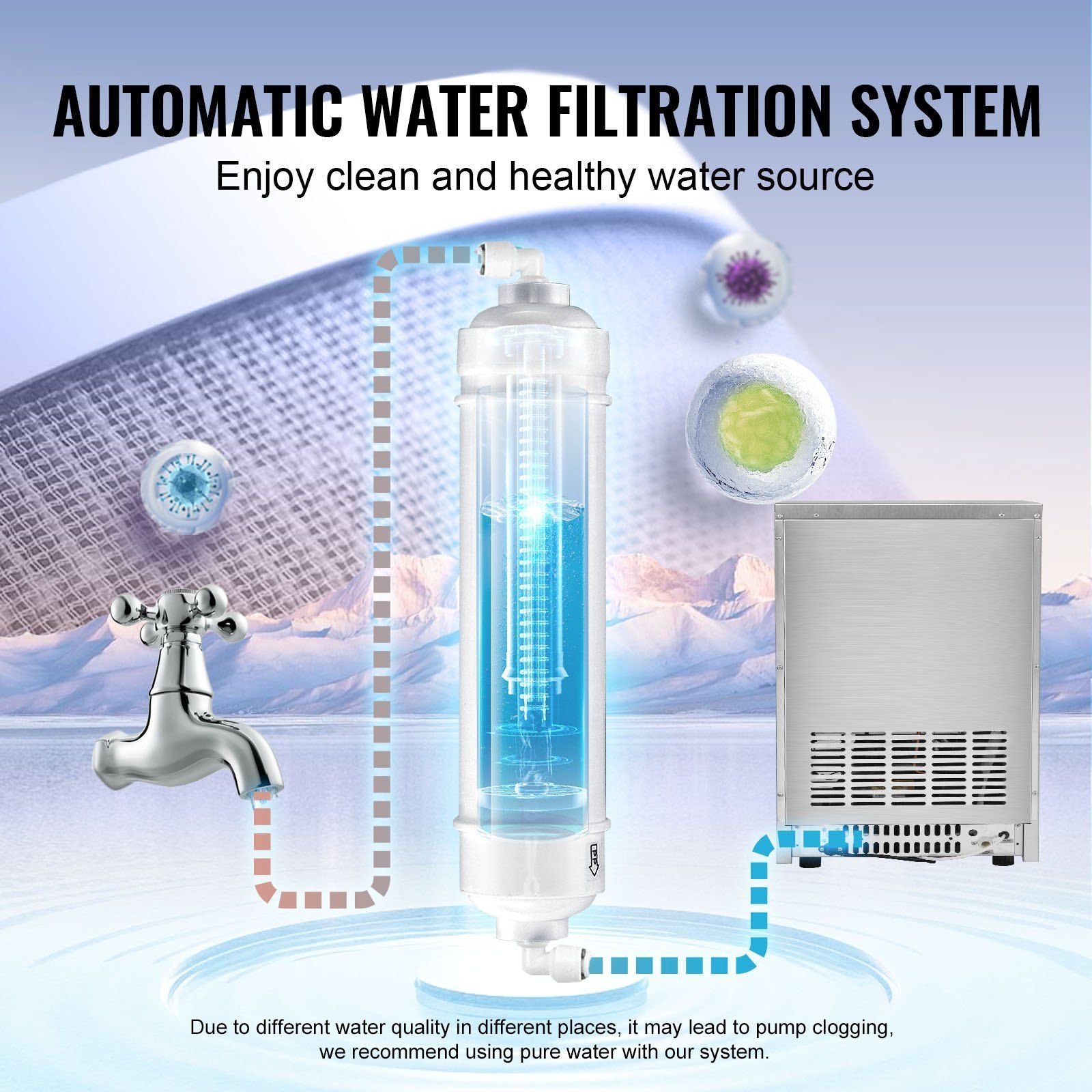 3.Make Cleaning a Breeze: Our ice machine comes with a one-touch self-cleaning function and a supplied water filter in the inlet pipe. Say goodbye to worries about impurities in your ice. Our state-of-the-art filtration system removes any unwanted particles, ensuring that only pure, clean water is used. It's not just ice - it's ice you can trust!
